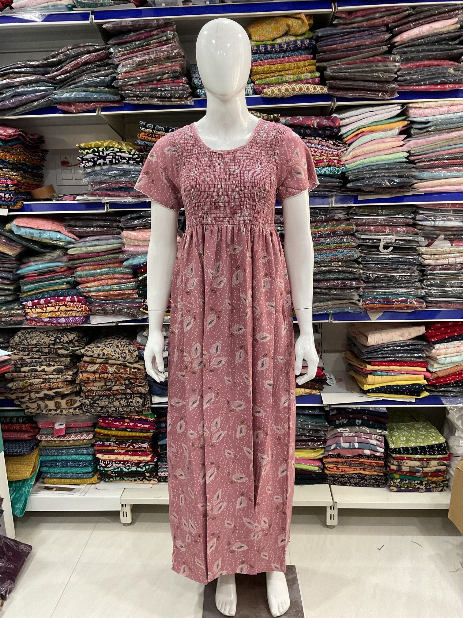 This Alpine fabric frock-style nighty is designed for maximum comfort and a stylish look. Made from soft and breathable Alpine fabric, it feels gentle on the skin, making it perfect for all-day and night wear. The full-body smocking design gives the nighty a unique texture while ensuring a stretchable and flexible fit, adapting to different body shapes for a comfortable experience. With no buttons, it offers a seamless, fuss-free wear. Ideal for lounging or sleeping, this nighty blends comfort, convenience, and style, making it a great addition to your nightwear collection.